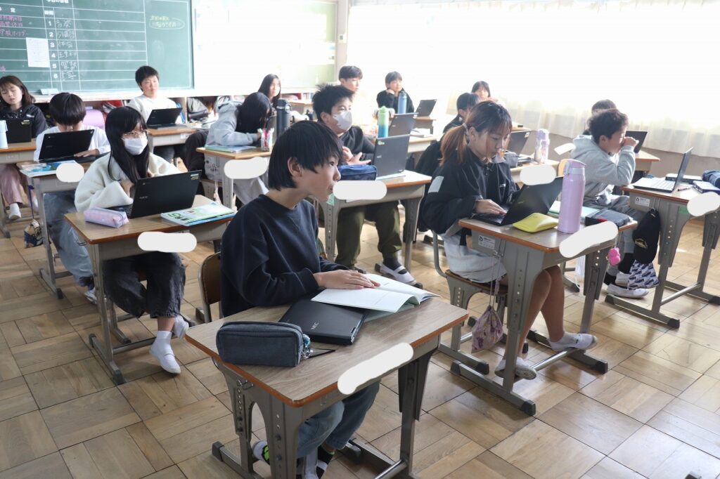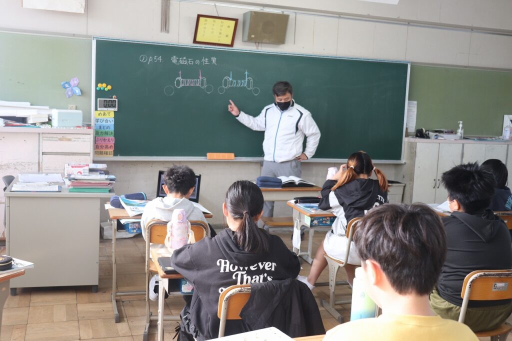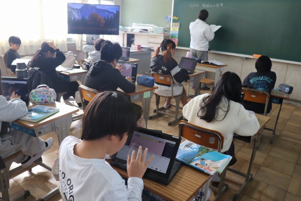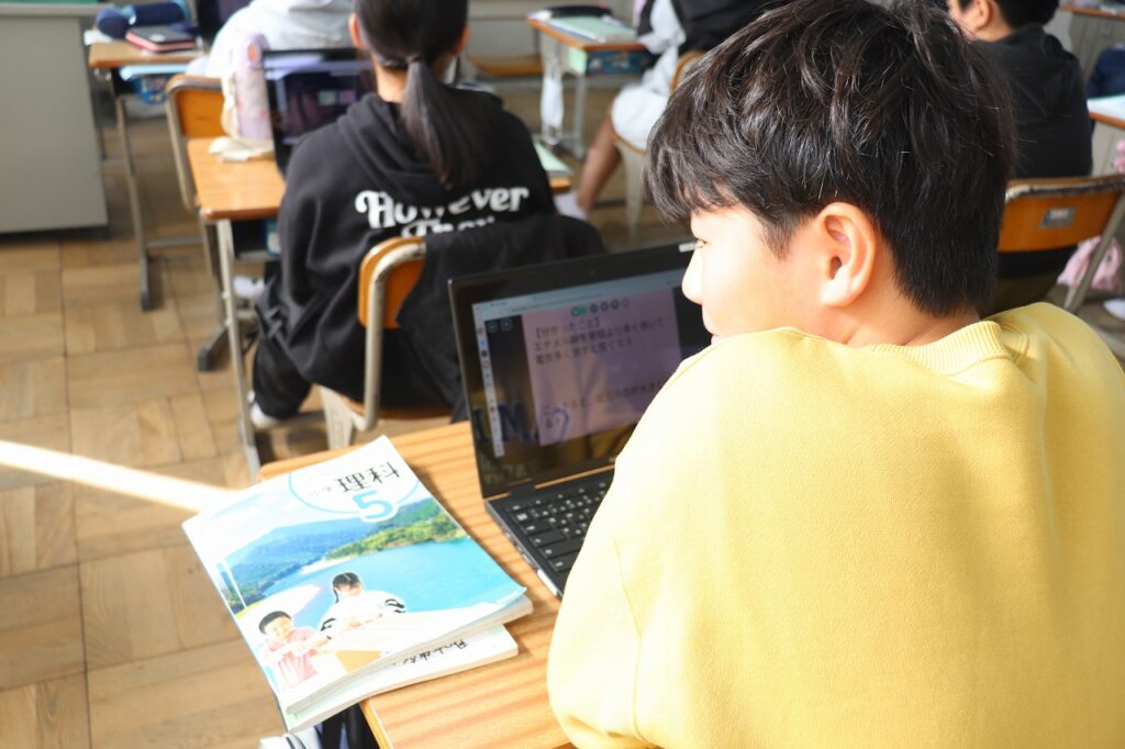 5年生の理科で、電磁石の性質について学習していました。タブレットやノートをつかい、分かったことをまとめたり、クラスで共有したりしていました。