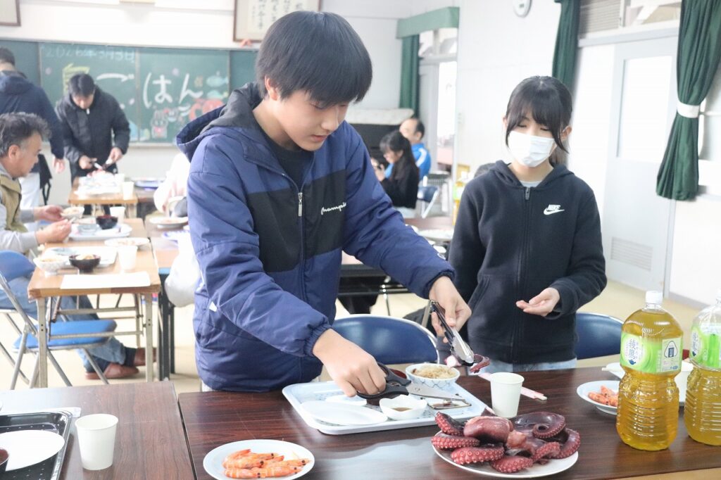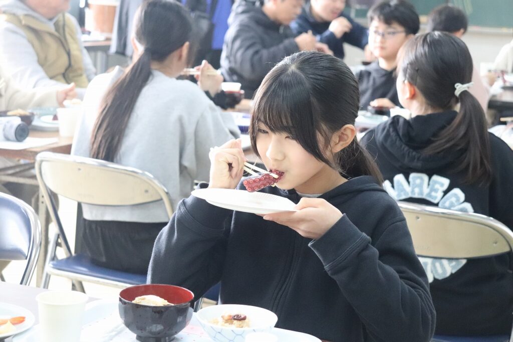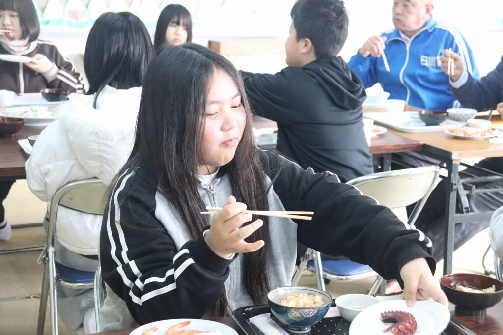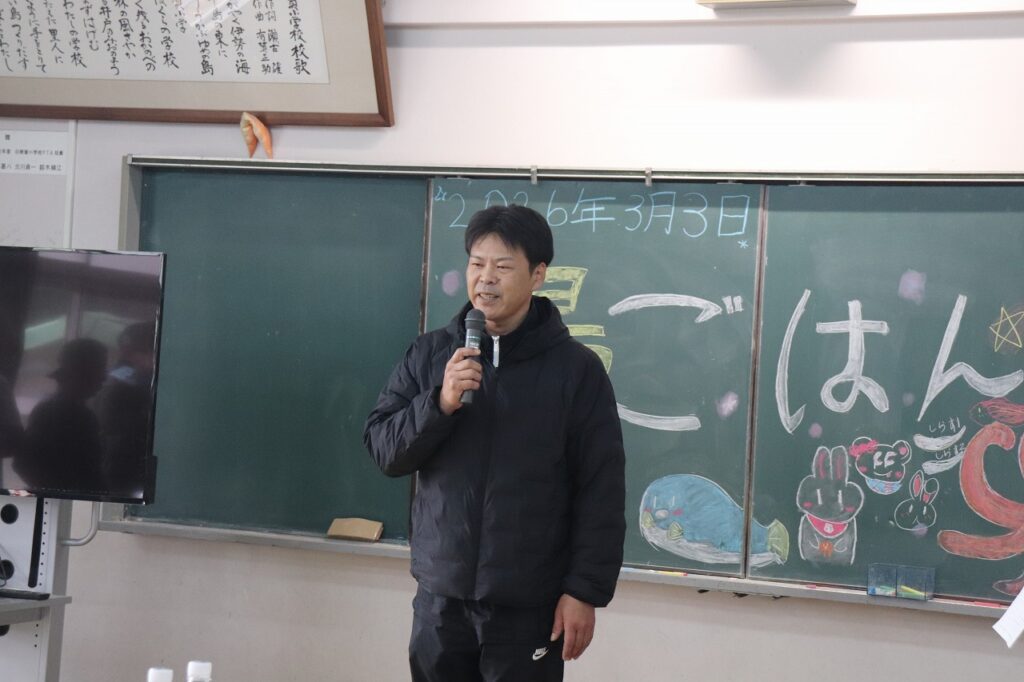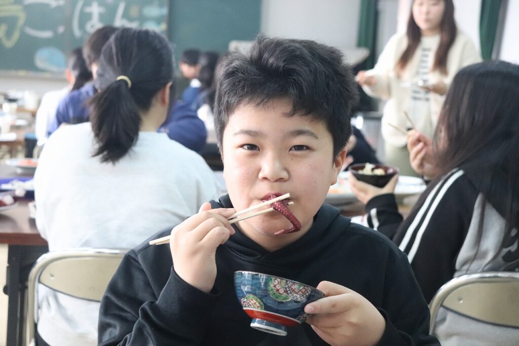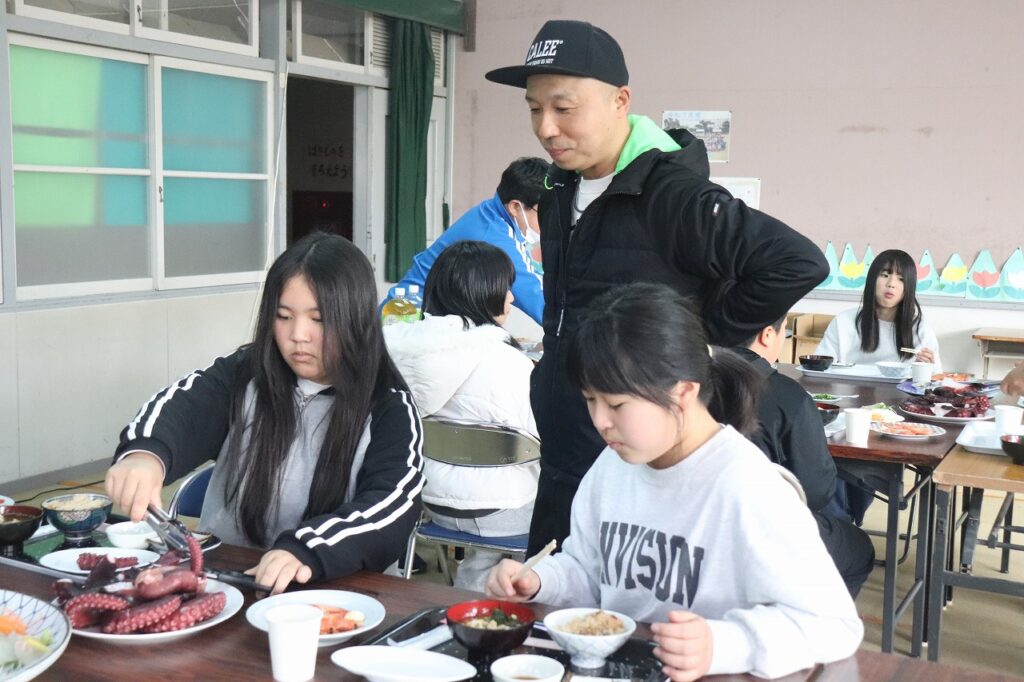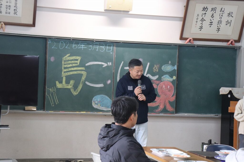 もうすぐ日間賀小学校を卒業する6年生をお祝いし、観光協会や漁協の皆様のご協力のもと「島ごはん」が開催されました。てっさや鯛のお刺身、たこの丸ゆでなど、日間賀島ならではの新鮮な海の幸をふんだんに使った郷土料理をご用意いただきました。子どもたちは、島の恵みを味わいながら、改めてふるさとの温かさを感じている様子でした。4月からは日間賀島を離れ、それぞれ新たな中学校生活が始まります。期待とともに不安もあると思いますが、地域の皆様からいただいた温かい励まし、そして「島ごはん」の思い出を胸に、これからもがんばってください。