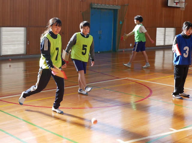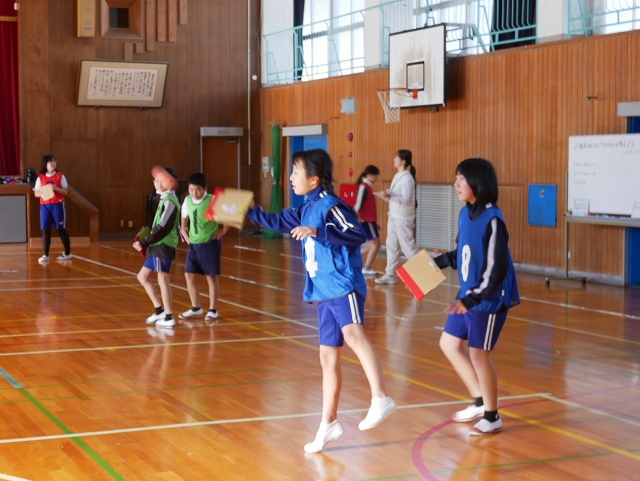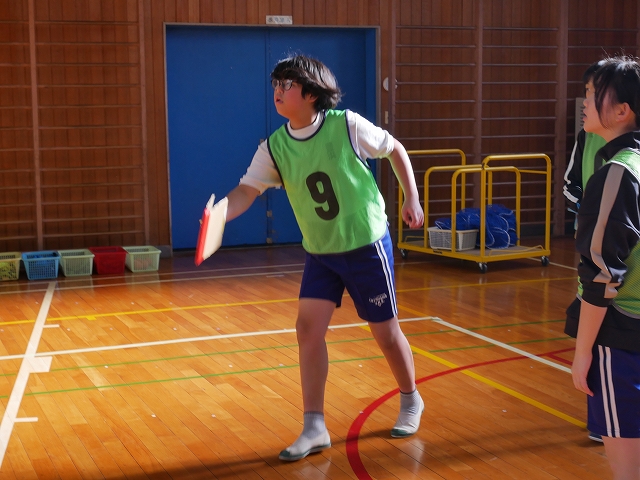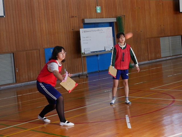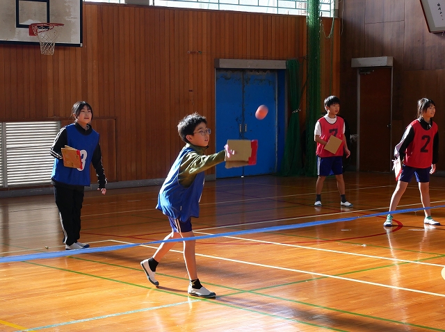 5年生は、体育の時間にネット型ボール運動「テニピン」をしていました。テニピンとは、作りの段ボールラケットを手にはめ、スポンジボールを返球しあうテニス型ゲームです。ゲームは、ダブルスで交互に打ち合います。チームで声をかけ合い、少しずつ上達しているようでした。