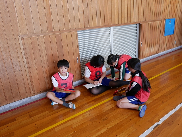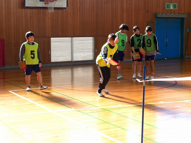 6年生は、体育の時間にネット型ボール運動「テニピン」をしていました。グループで練習をした後に、グループで課題を話し合い、さらに練習を重ねていました。