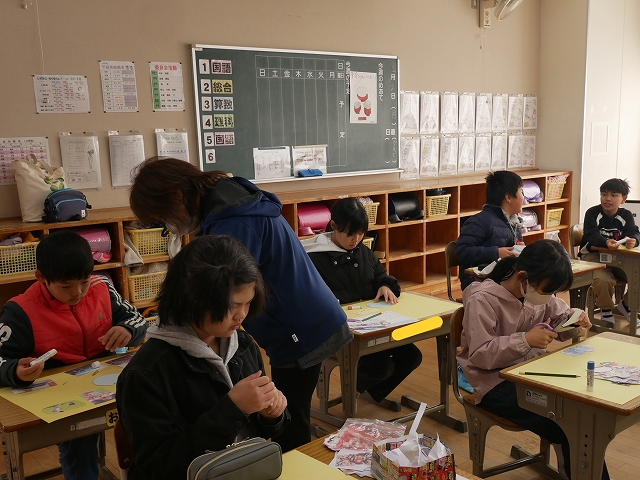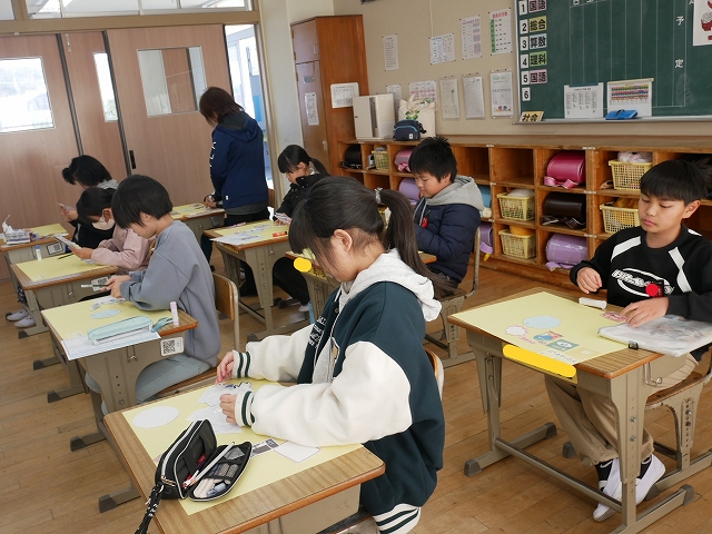 4年生の新年初めての授業は、書写でした。新年らしく「初春」という字を毛筆で書いていました。みな真剣な表情で取り組んでいました。
