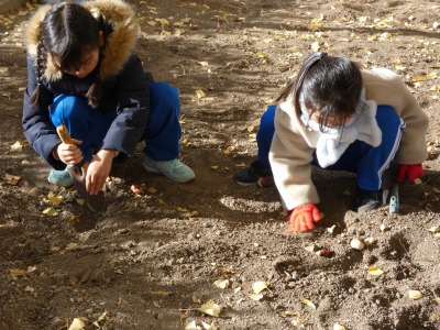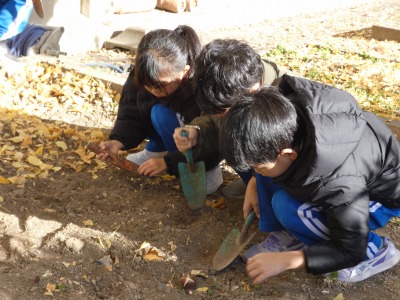 外の畑から元気な声が聞こえてきました。行ってみると、1年生と2年生が、一緒にチューリップの球根を植えていました。春になるのが楽しみですね。