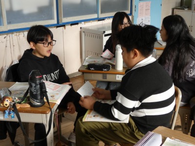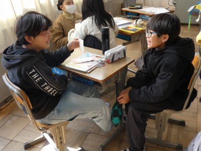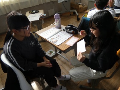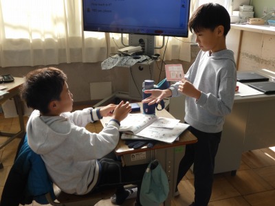 5年生の外国語で、レストランでの注文場面のコミュニケーション活動に取り組んでいました。“What would you like?” “I’d like ~.” などの表現を使って、やりとりをしています。真剣に、そして、楽しそうに活動していました。