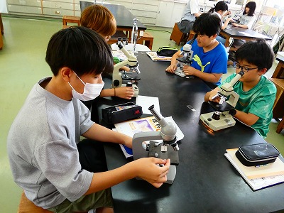 6年生の理科の授業で、顕微鏡を使った観察を行います。まず、顕微鏡の使い方を学びます。光を取り入れたり、ステージの高さを調節したり、対物レンズの倍率を変更したりなど、操作方法や注意事項について、実際に操作しながら確認しています。