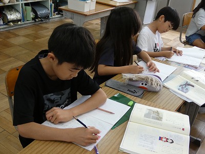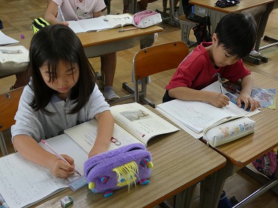 3年生の国語の授業で、本に親しむことを目的として、本の内容をクイズにする活動をしていました。教科書にある「鳥になった きょうりゅうの話」という話の内容から一人一人がクイズをつくり、他の子に問題として出しました。授業の最後には、学習したことの振り返りをしています。