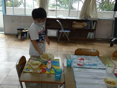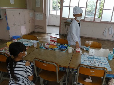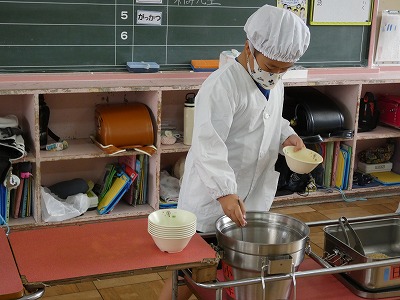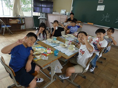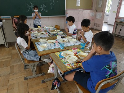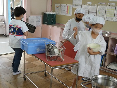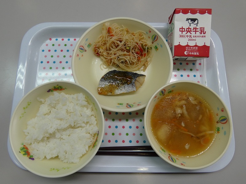 <献立> ごはん、牛乳、鰆の香味ソースかけ、ビーフン入り野菜炒め、冬瓜の中華スープ