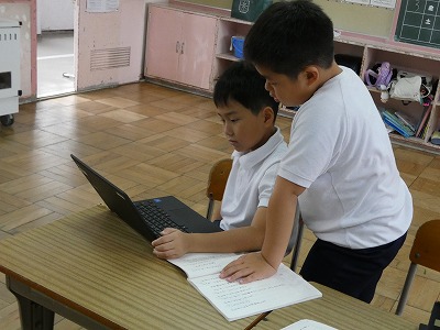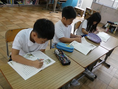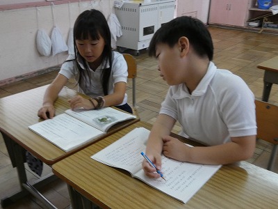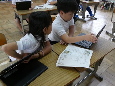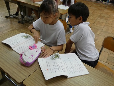 2年生の国語の授業で、「お手紙」という読み物教材を使って学習をしています。登場人物の「がまくん」「かえるくん」の会話が多くある読み物です。まず、それぞれの会話文がどちらの言葉なのかを確認し、その後、最初の場面について、登場人物の行動を読み取りました。