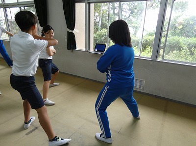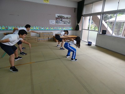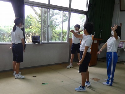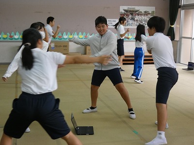 なかよしルームから元気な声が聞こえてきました。6年生が、ソーラン節の練習をしています。グループごとに分かれ、手本の動画を見たり、自分たちの踊りの様子を動画で確認したりしながら取り組んでいます。今日から10月。島民体育祭に向けて、みんながんばっています。
