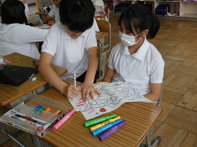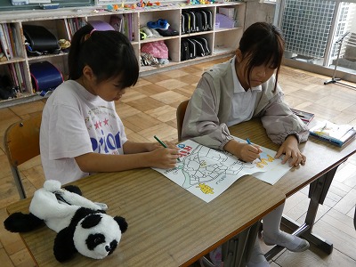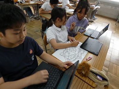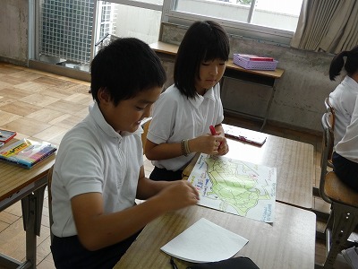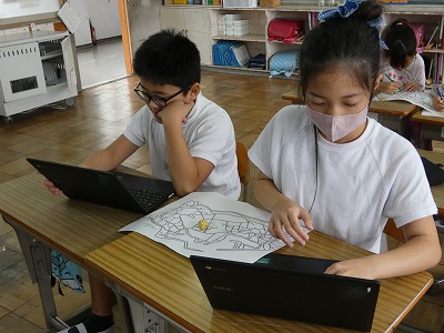 4年生の総合の授業で、日間賀島ガイドブックの制作に取り組んでいます。それぞれのテーマに沿ってグループで活動していて、今日は、調べた場所の地図づくりに取りかかっています。