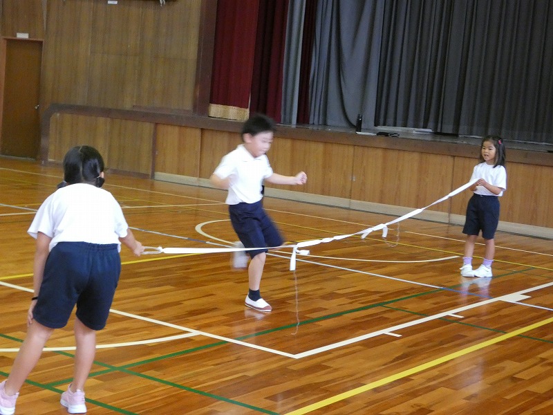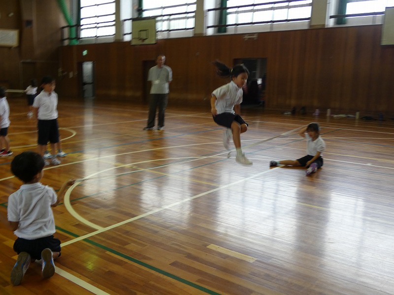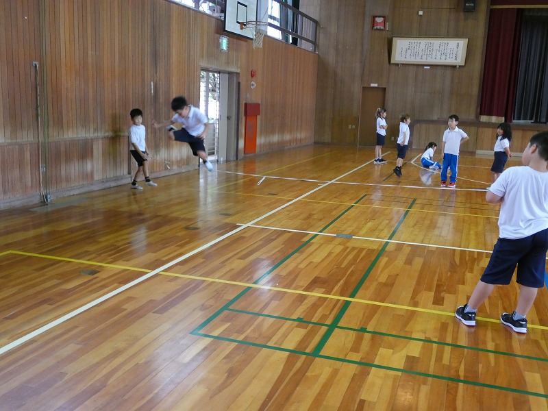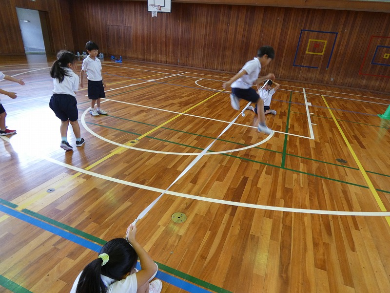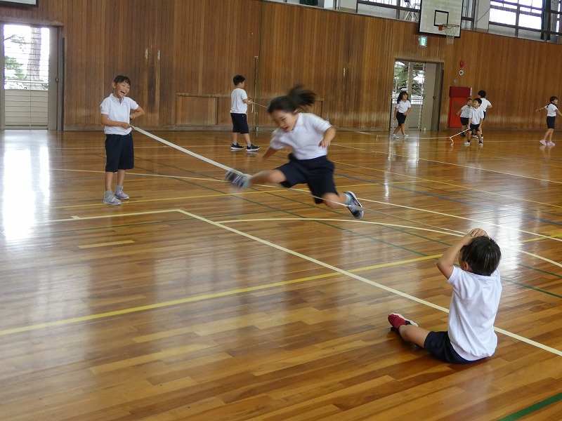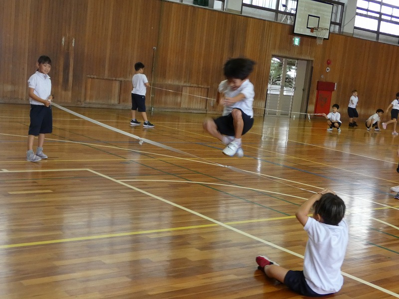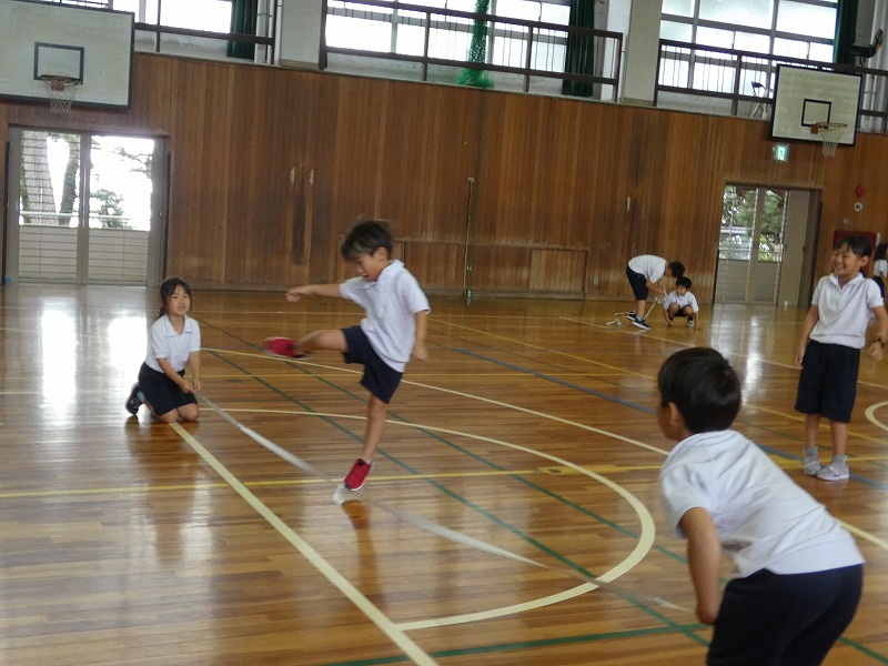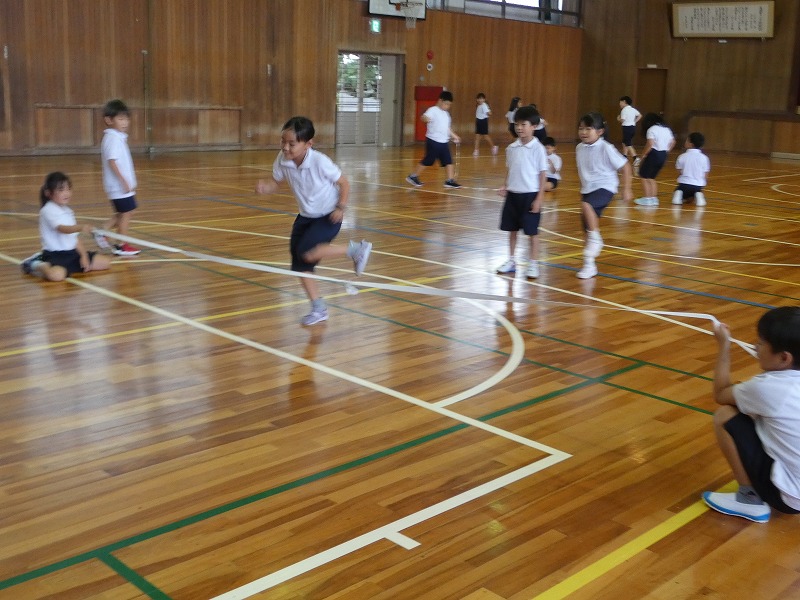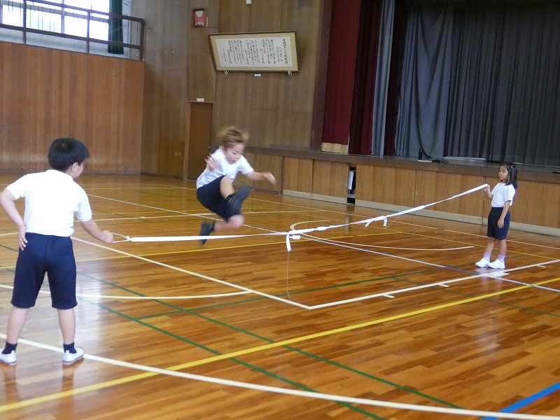 1、2年生の体育の授業で、ゴム紐を跳び越す運動をしていました。自分で跳ぶ高さを決め、しっかりと助走をして、思いっきり跳んでいます。しっかりと体を動かして、楽しそうに取り組んでいます。