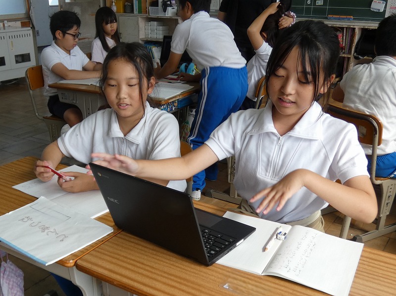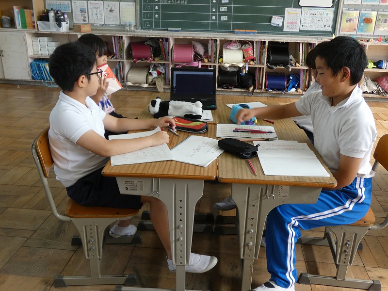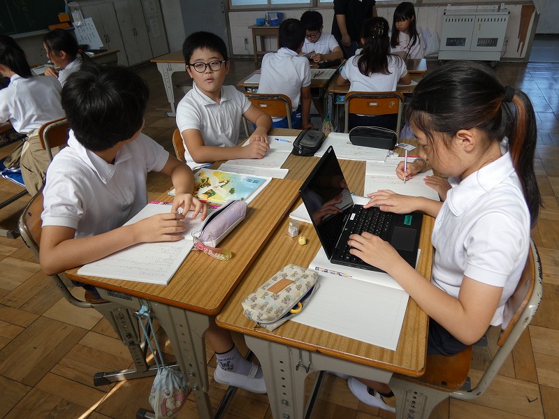 4年生の国語の授業で、「ごんぎつね」の物語文を読み、ごんと兵十の気持ちの変化を読み取る学習が続いています。今日は、ごんのつぐないの場面について考えました。グループごとに意見を交換し、タブレット使ってまとめています。