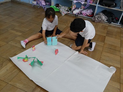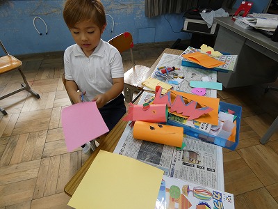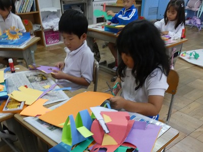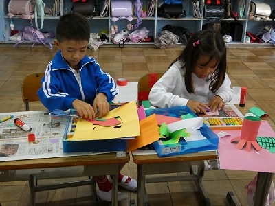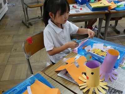 1年生の図工の授業で、「おって たてたら」の制作活動が始まりました。紙を切ったり、折ったりして、立てせてできる形から作品をイメージします。「ひまかランドをつくろう」というテーマで、一人一人がいろいろなものを制作し、教室の後ろにある「ひまかランド」のスペースに立てています。楽しそうに制作活動に取り組んでいます。