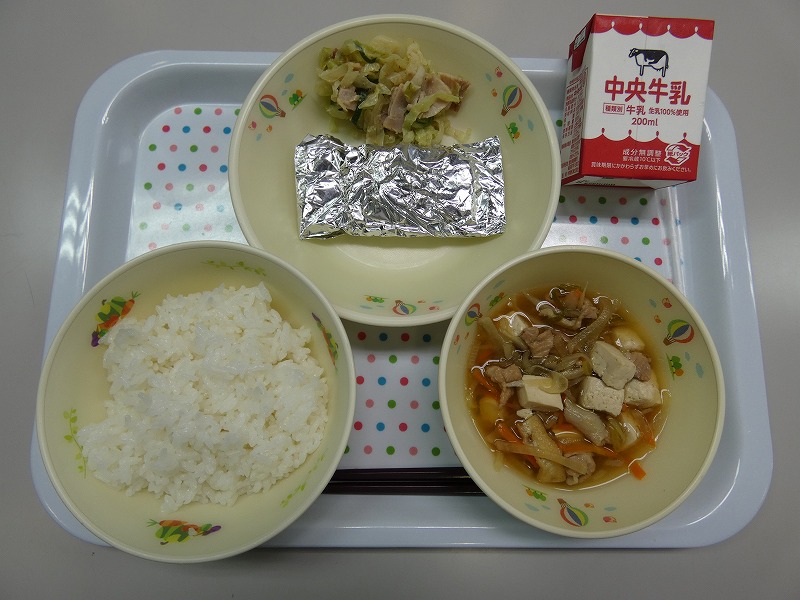 <献立> ごはん、牛乳、さばの銀紙焼、キャベツのごま和え、さわにわん