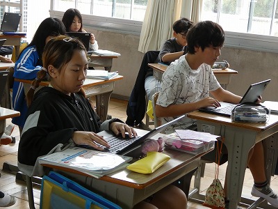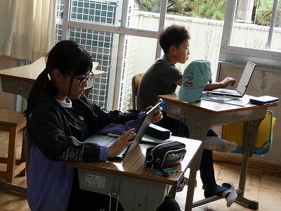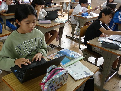 5年生の理科の授業で、台風について学習していました。最近の台風の動きを確認した後、日本の南方にある台風の動きについて、タブレットを使って予想進路を記入しています。身近な事象と関連付けて学習すると、理解しやすいですね。