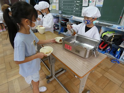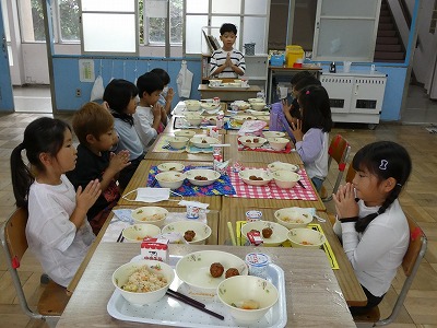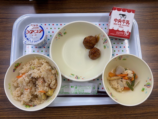 <献立> 栗入り炊き込みごはん、牛乳、愛知の肉団子、里芋と野菜の含め煮、ヨーグルト