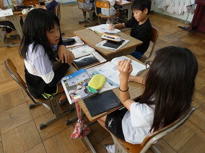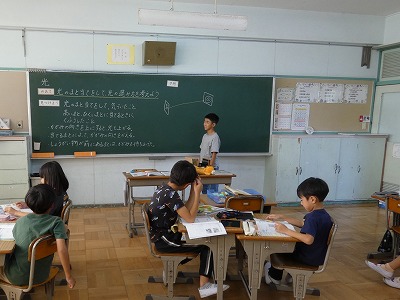 3年生の理科の授業で、「光」に関する学習が始まりました。今日は、鏡を使って光の的当てをした結果を基に、光の進み方を予想しました。進んでいる状況を目で確認することは困難です。今後どんな実験をすれば確認できるか、みんなで考えています。