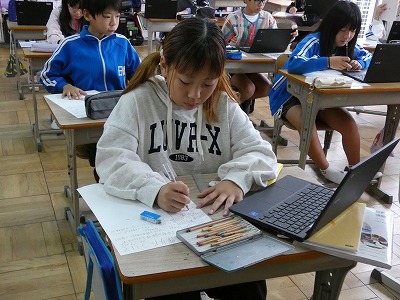 5年生の社会の授業で、自動車工業について学習をしてきました。校外学習の訪問先で学んだことも含め、壁新聞の作成しています。実際に見たり聞いたりして学んだことと、調べたことを整理しながらまとめています。