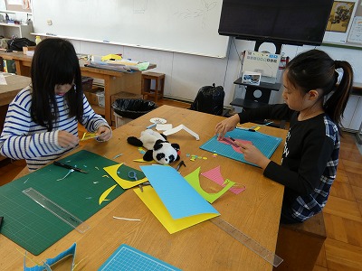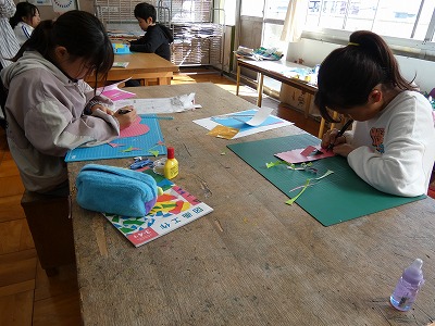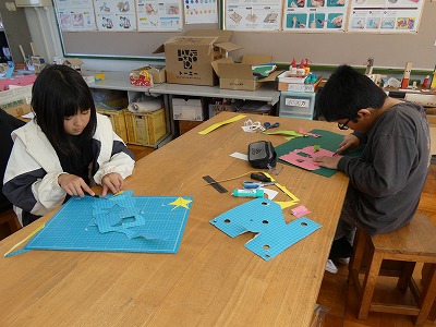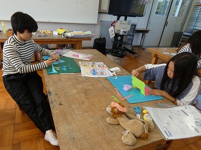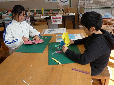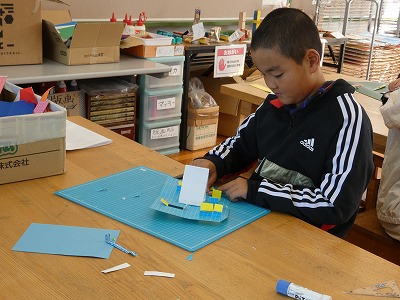 4年生の図工の授業で、「幸せを運ぶカード」の制作が始まりました。カッターナイフで切り込みを入れたり、他の紙を折って入れたりして、飛び出す仕組みを使ったメッセージカードを作ります。どんなカードができあがるかな。