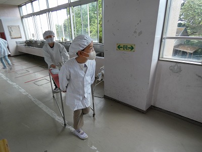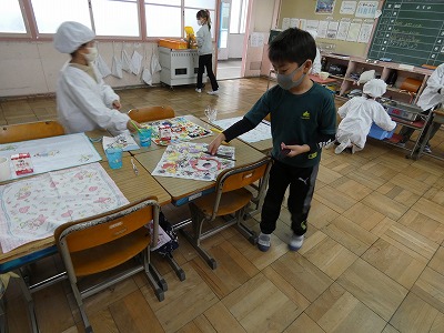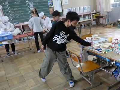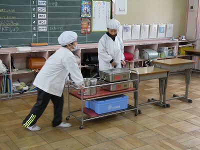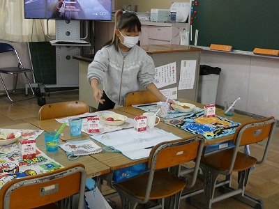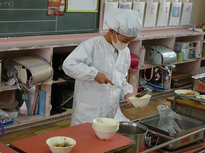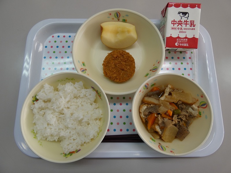 <献立> ごはん、牛乳、和風コロッケ、豚肉と大根の旨煮、りんご