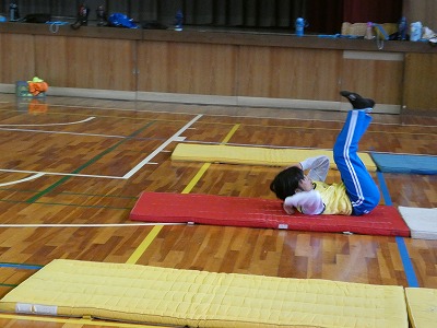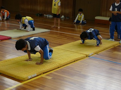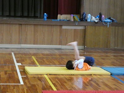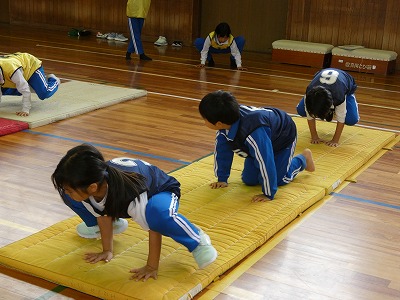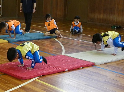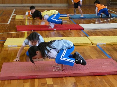 3年生の体育の授業で、マット運動に取り組んでいます。1、2年生で学習してきた技も確認しています。上手にできる子の動きを見て、参考にしながら練習していました。