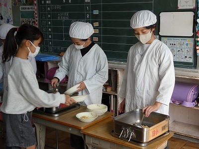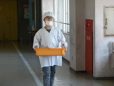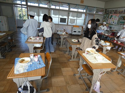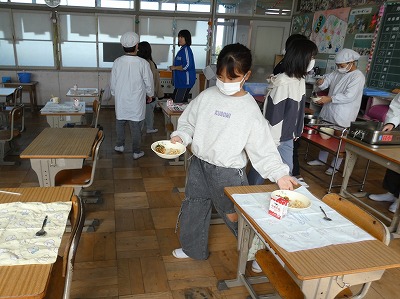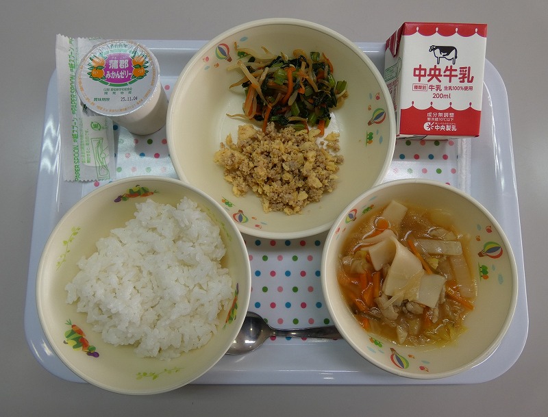 <献立> ごはん、牛乳、ビビンバの具、ナムル、ワンタンスープ、蒲郡みかんゼリー