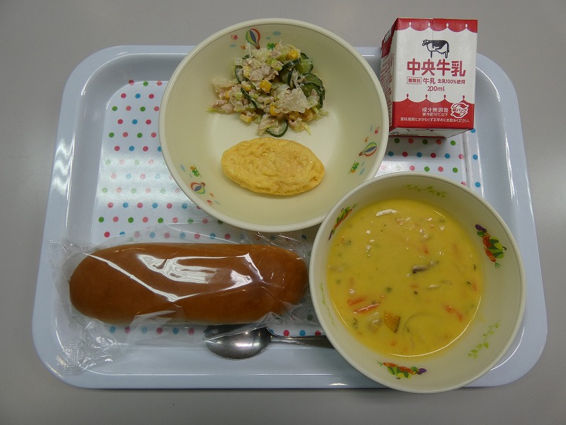 <献立> ミルクロールパン、牛乳、オムレツ、ツナサラダ、パンプキンポタージュ