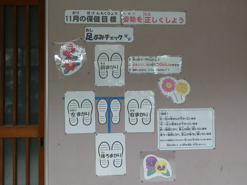 11月の保健目標は、「姿勢を正しくしよう」です。保健室横の掲示板に、「足踏みチェック」の掲示があります。目を閉じて、30秒間その場で足踏みをし、最初の位置との違いをチェックするものです。寒くなってくると、背中が丸まり、姿勢が悪くなりがちです。ご家庭でもお子様と一緒にチェックをして、よい姿勢で過ごせるよう話題にしてみてください。