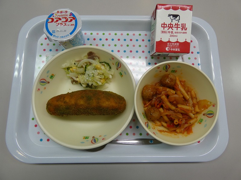 <献立> 抹茶きなこ揚げパン、牛乳、肉団子とパスタのトマトソース、コールスローサラダ、ヨーグルト