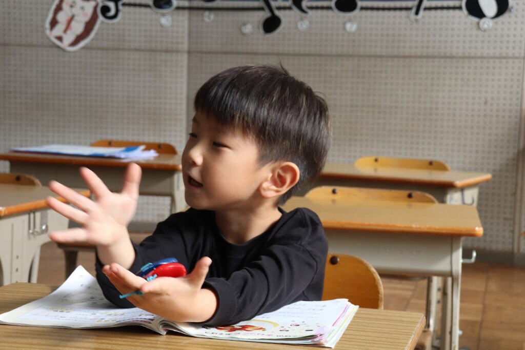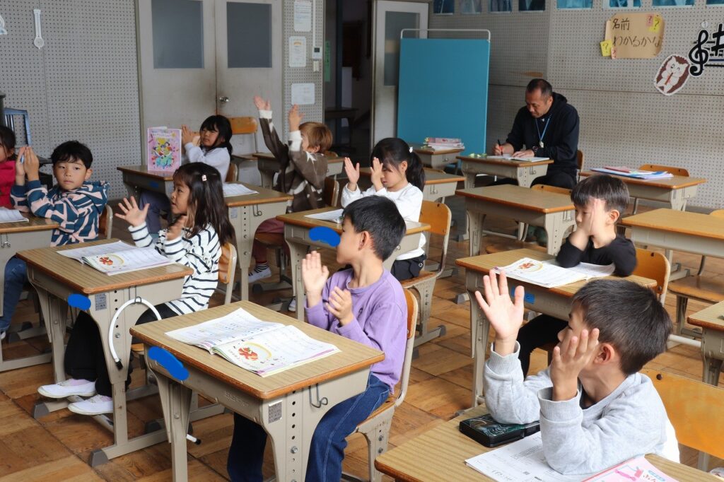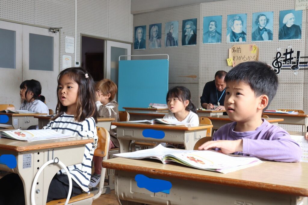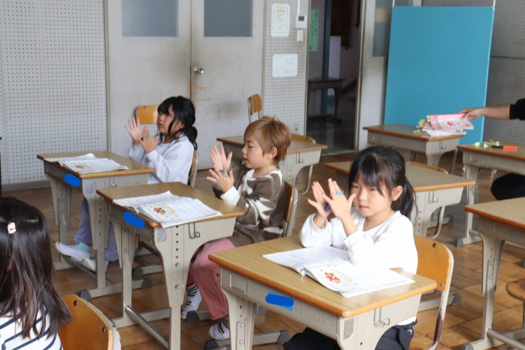 1年生の音楽で、「フルーツケーキ」を歌いました。歌に合わせて、みんなで楽しい「まねっこ遊び」にチャレンジ。さらに、カスタネットを使って、歌のリズムに合わせて元気よく音を鳴らしました。