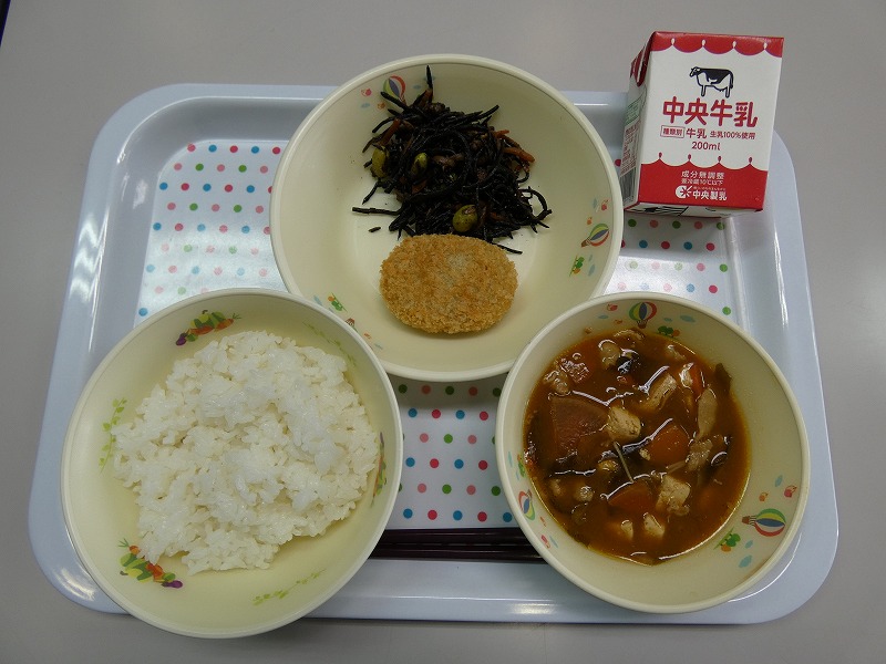 <献立> ごはん、牛乳、さつまいもコロッケ、ひじきの炒め煮、豚汁