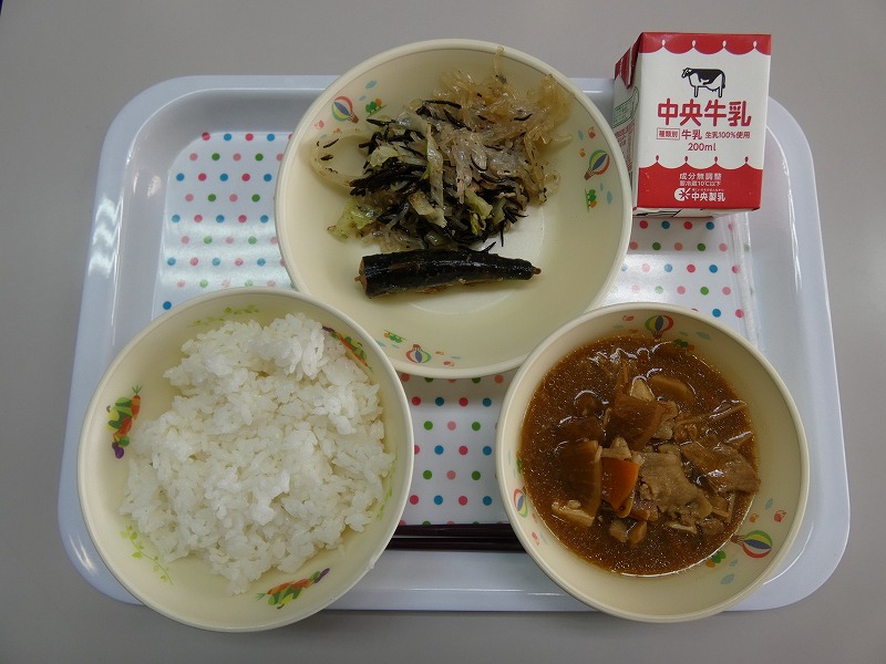 <献立> ごはん、牛乳、いわし生姜煮、ひじきと春雨のごま酢和え、きのこのみそ汁