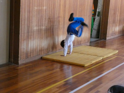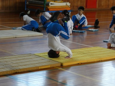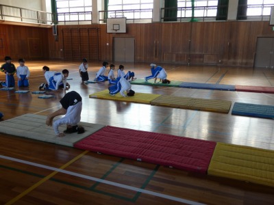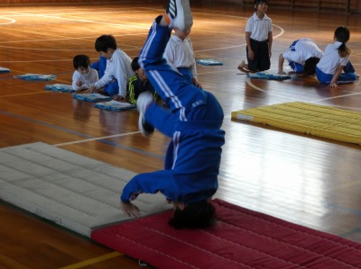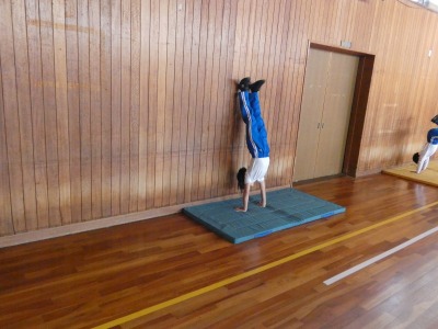 体育館をのぞくと、3年生が体育の授業でマット運動に取り組んでいました。逆さ感覚や腕支持感覚が必要な、倒立系の技に挑戦していました。いろいろな技に挑戦することで、回転感覚、逆さ感覚、腕支持感覚など、器械運動に必要な感覚が磨かれますね。