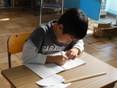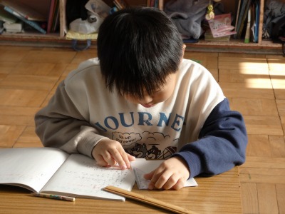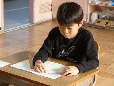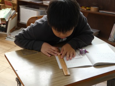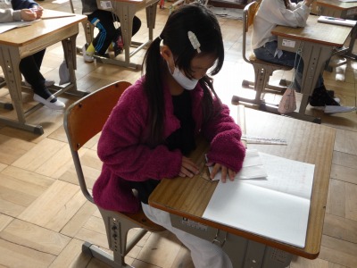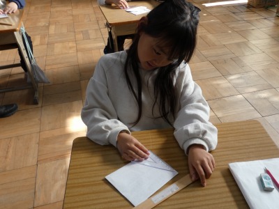 2年生の算数で、「三角形と四角形」の単元の学習が進んでいます。教室をのぞくと、紙を折って作った正方形の辺や角について調べ、ノートに気づいたことを書き出していました。辺の長さを測ったり、三角定規の角と重ねたりしながら、体験的に辺の長さや角の大きさの概念について学んでいます。