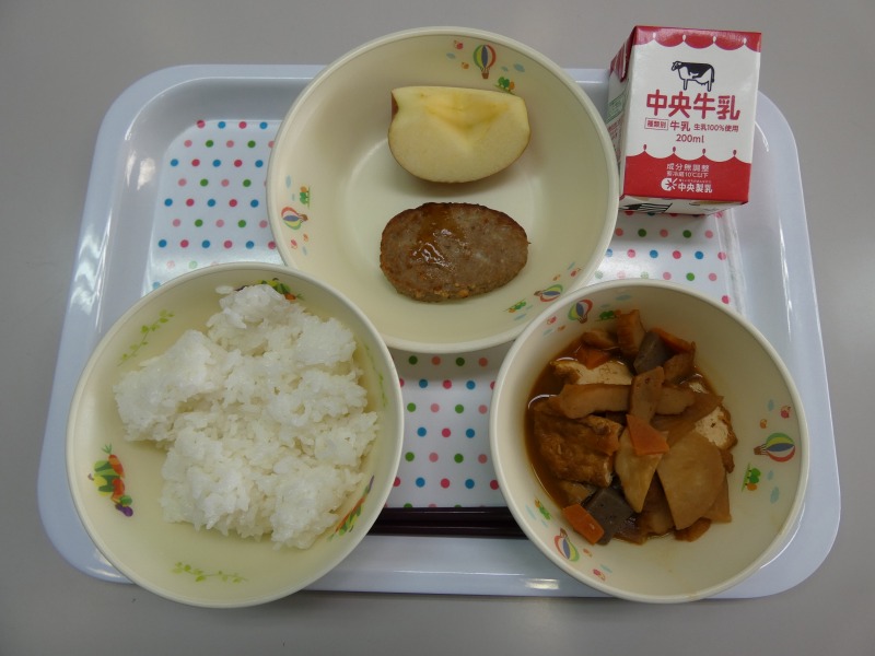 <献立> ごはん、牛乳、キャベツ入りつくね、ツナともやしの和え物、玉麩汁