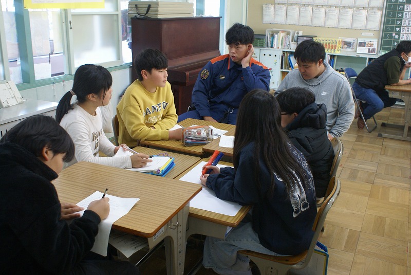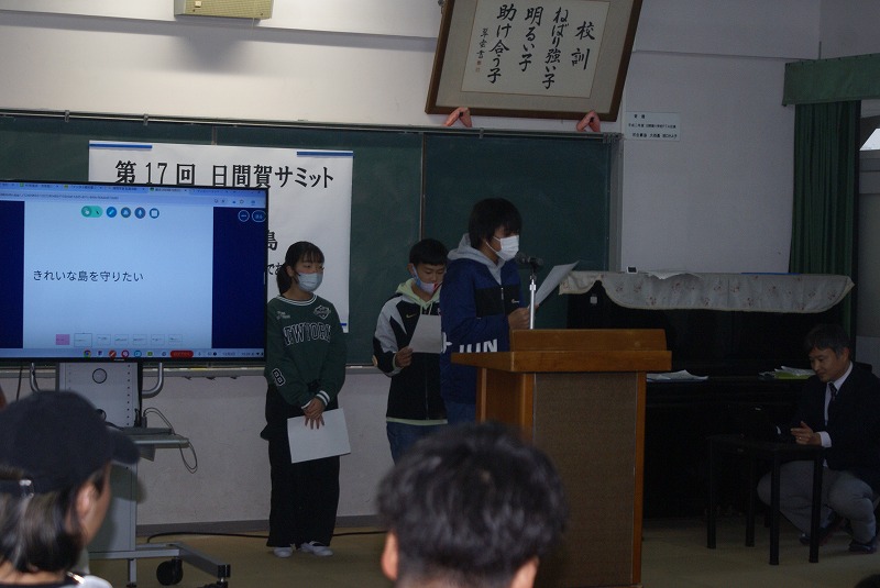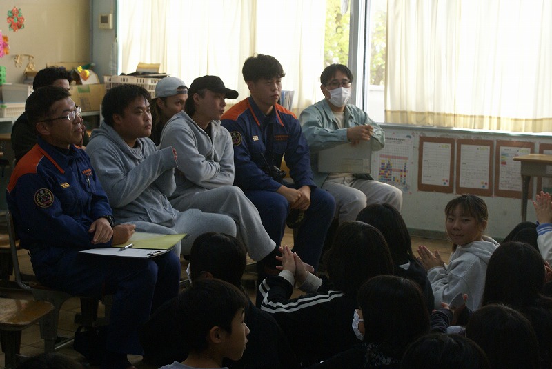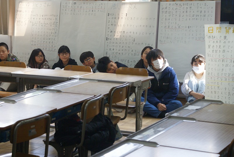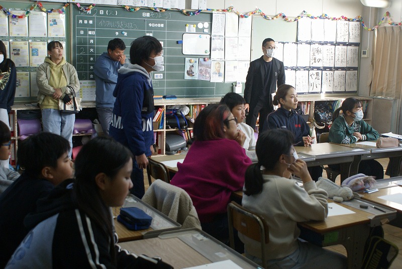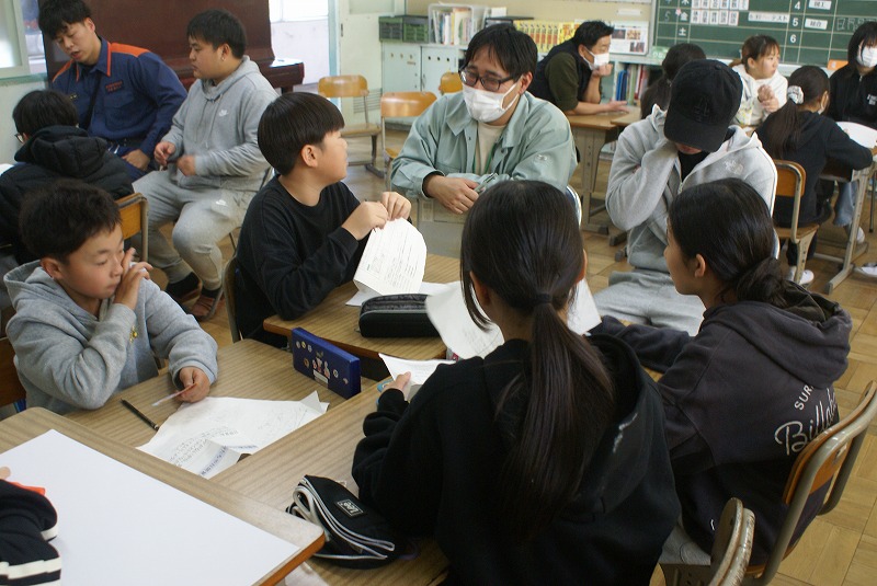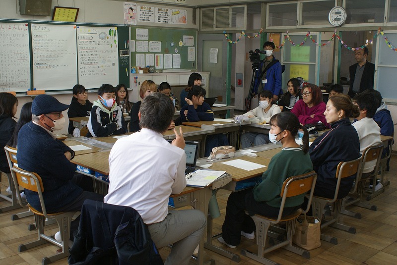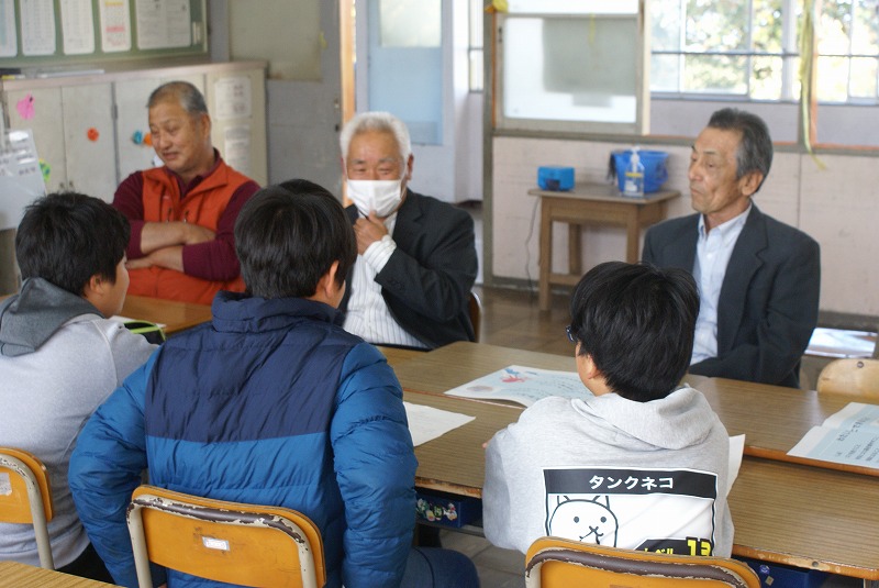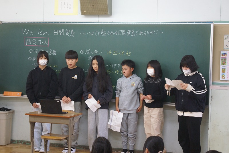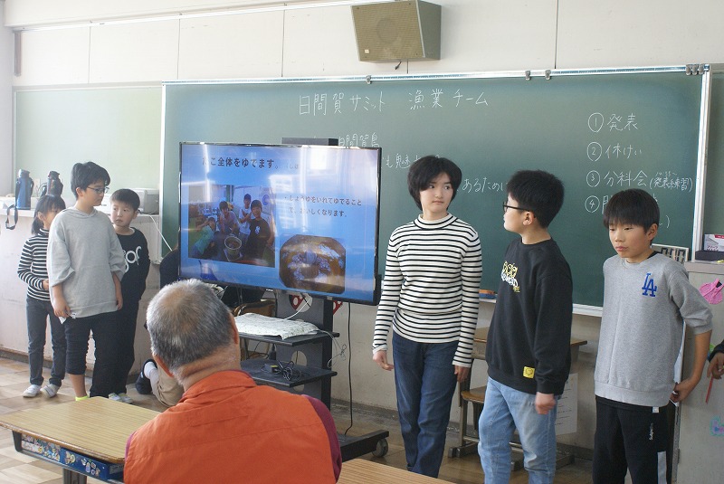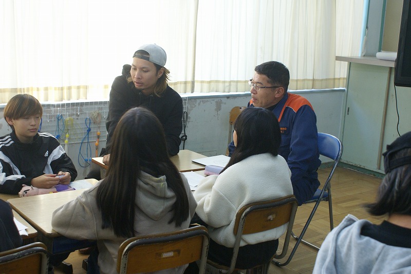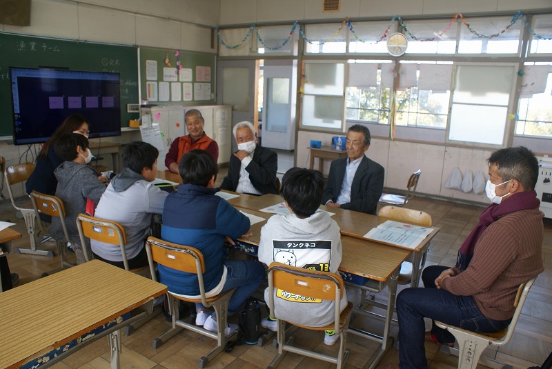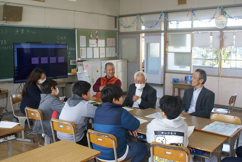 今日は、学習成果の発表の場であり、さらに発展的な学びとして、漁業・観光・防災それぞれに関わりのある島民の皆さんや、町の職員の方々にお越しいただき、テーマに沿って子どもたちとの話し合いに参加していただきました。