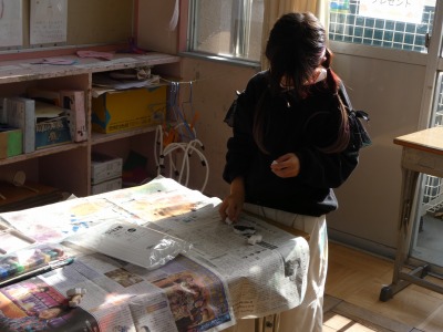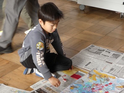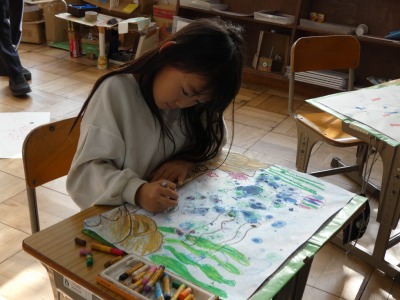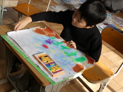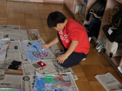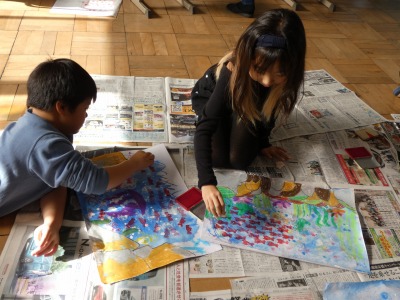 2年生の図工で続けていた読書感想画の制作も、仕上げの段階に入りました。スイミーや仲間の赤い魚は、発泡スチロールで作ったスタンプで描いています。まもなく完成です。