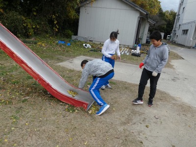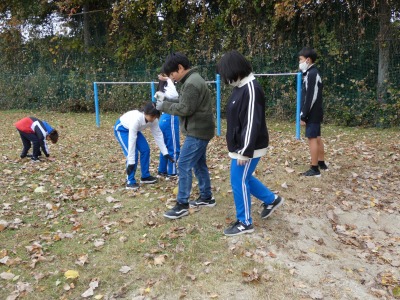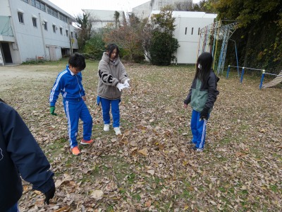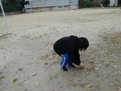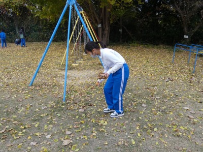 6年生の図工で、身の回りの自然を感じる場所で造形遊びをします。校庭で、落ち葉を使って、自分なりにイメージを膨らませていました。自由な発想で、楽しく活動しています。
