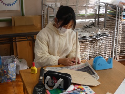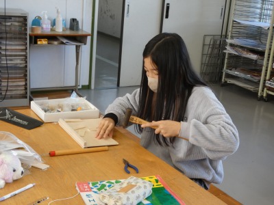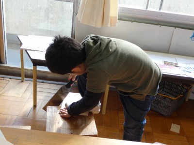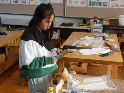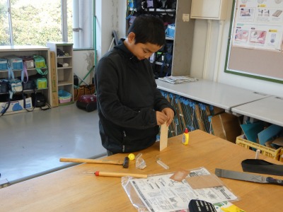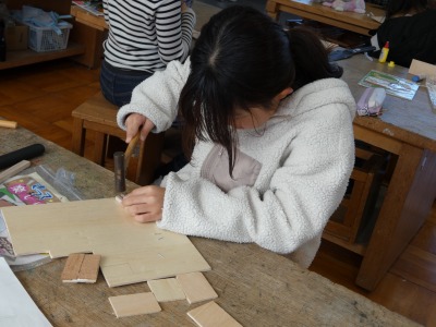 4年生の図工で、木材を使った制作を行っています。木材を切って組み合わせることで、イメージする形にしていきます。そして、コルクボードを貼り、伝言板など身近に活用できる作品に仕上げます。のこぎりや金づちなど、図工の授業で使ってきたいろいろな道具を使って制作しています。