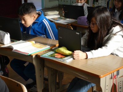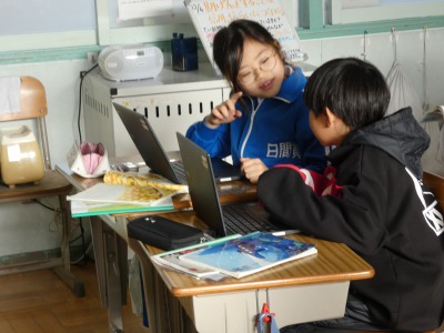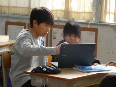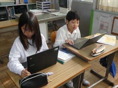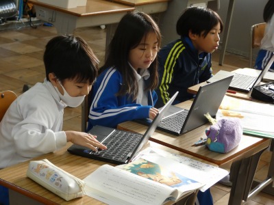 3年生の国語で、「三年とうげ」という物語を使った学習が進んでいます。今日は、出来事や登場人物の気持ち、文の調子などに着目して、この物語のおもしろさをまとめました。一人一人がまとめたものはタブレットを使って共有し、お互いに読み合っています。