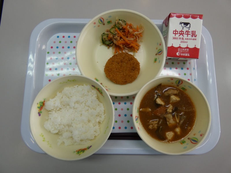 <献立> ごはん、牛乳、キャベツ入りメンチカツ、にんじんのごま和え、豚汁