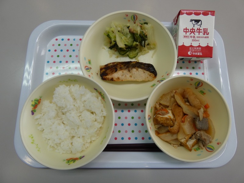 <献立> ごはん、牛乳、鮭のみそマヨネーズ焼き、豚肉と大根の旨煮、酢のもの