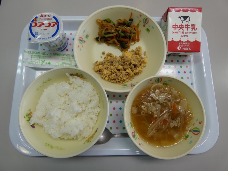 <献立> ごはん、牛乳、ビビンバの具(肉卵そぼろ)、ナムル、八宝湯、ヨーグルト