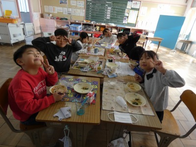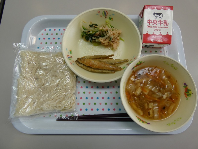<献立> ソフトめん、牛乳、和風汁、わかさぎの唐揚げねぎソース、ささみともやしの和え物