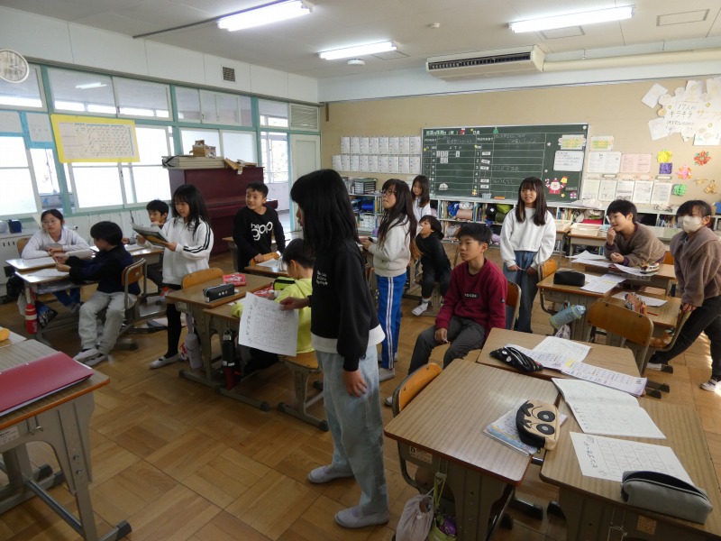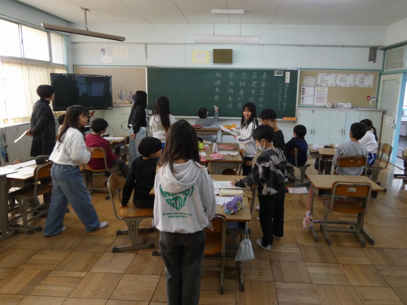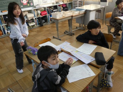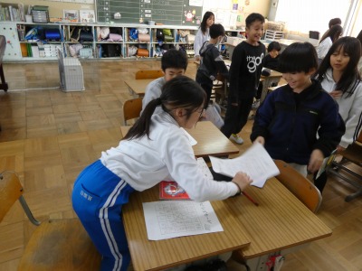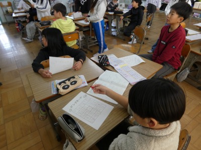 3年生の教室から、元気な声が聞こえてきました。教室をのぞくと、漢字ビンゴゲームを行っています。3年生で学習した漢字の中から、一人一人ビンゴカードを作ります。先生が一つずつ漢字を示し、1列そろったらビンゴです。ただし、漢字が正しく書けていない場合はビンゴになりません。楽しく漢字の復習ができましたね。