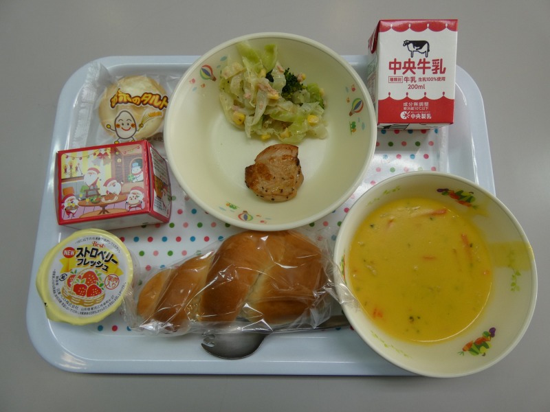 <献立> 愛知ツイストロールパン、牛乳、鶏肉の香味焼き、ブロッコリーサラダ、パンプキンポタージュ、クリスマスセレクトデザート(チョコケーキ・お米タルト・イチゴゼリー)