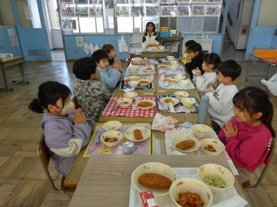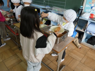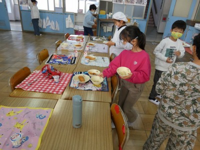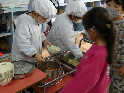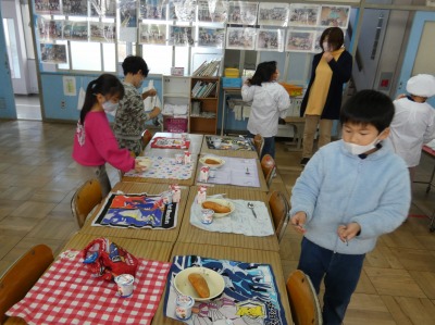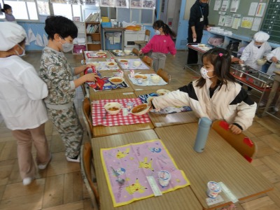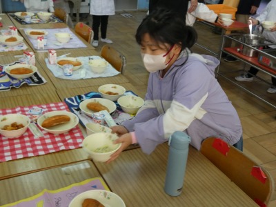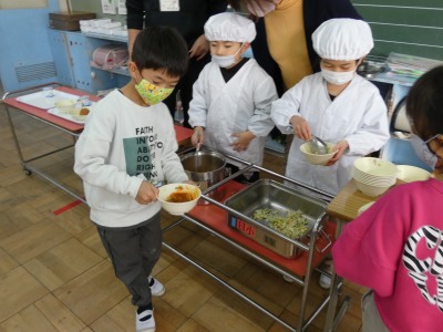 3学期最初の給食です。久しぶりの給食ですが、1年生もテキパキと準備をしています。