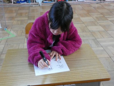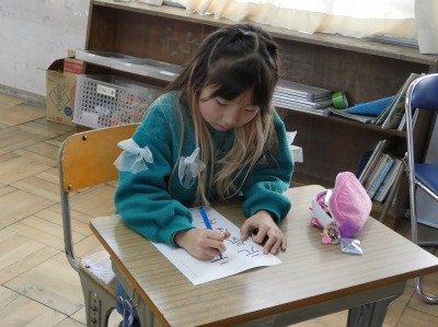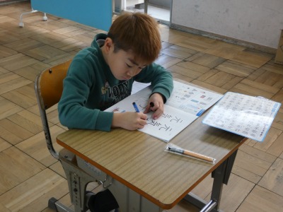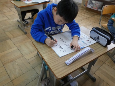 2年生の書写の授業で、「元気な子」の練習をしていました。まずは、書写ノートを使ってなぞり書きをし、なぞり書きができたらプリントを使って練習です。お手本をよく見て丁寧に書いています。