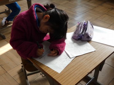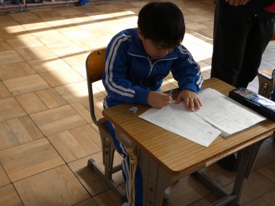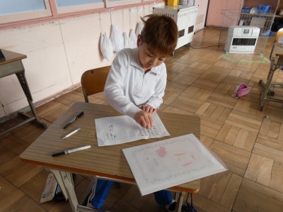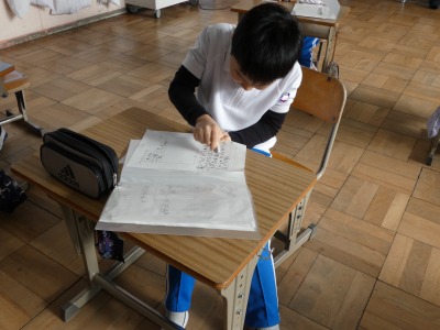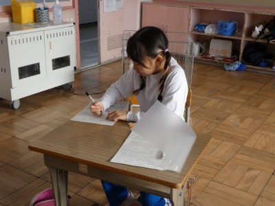 2年生の生活科で、自分が生まれたときのことなどについて、お家の人にインタビューを行いました。そのインタビューで聞き取ったことをまとめていました。ペンで清書をして、ファイルに綴じます。自分の成長や、お家の人の気持ちがよく分かりますね。