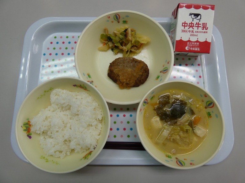 <献立> ごはん、牛乳、ハンバーグのおろし、小松菜と油揚げのおひたし、豆乳入り白味噌汁