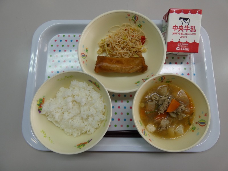 <献立> ごはん、牛乳、春巻き、ビーフン入り野菜炒め、ピリ辛スープ
